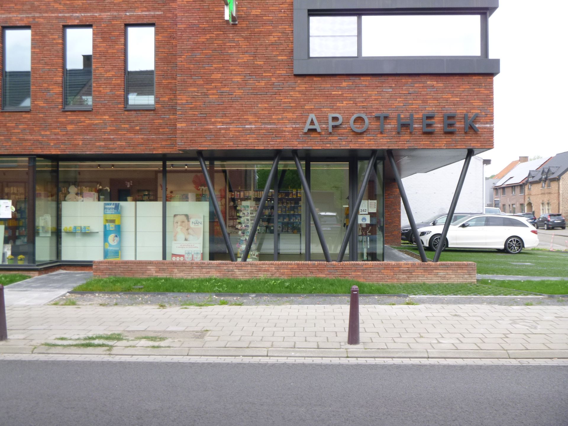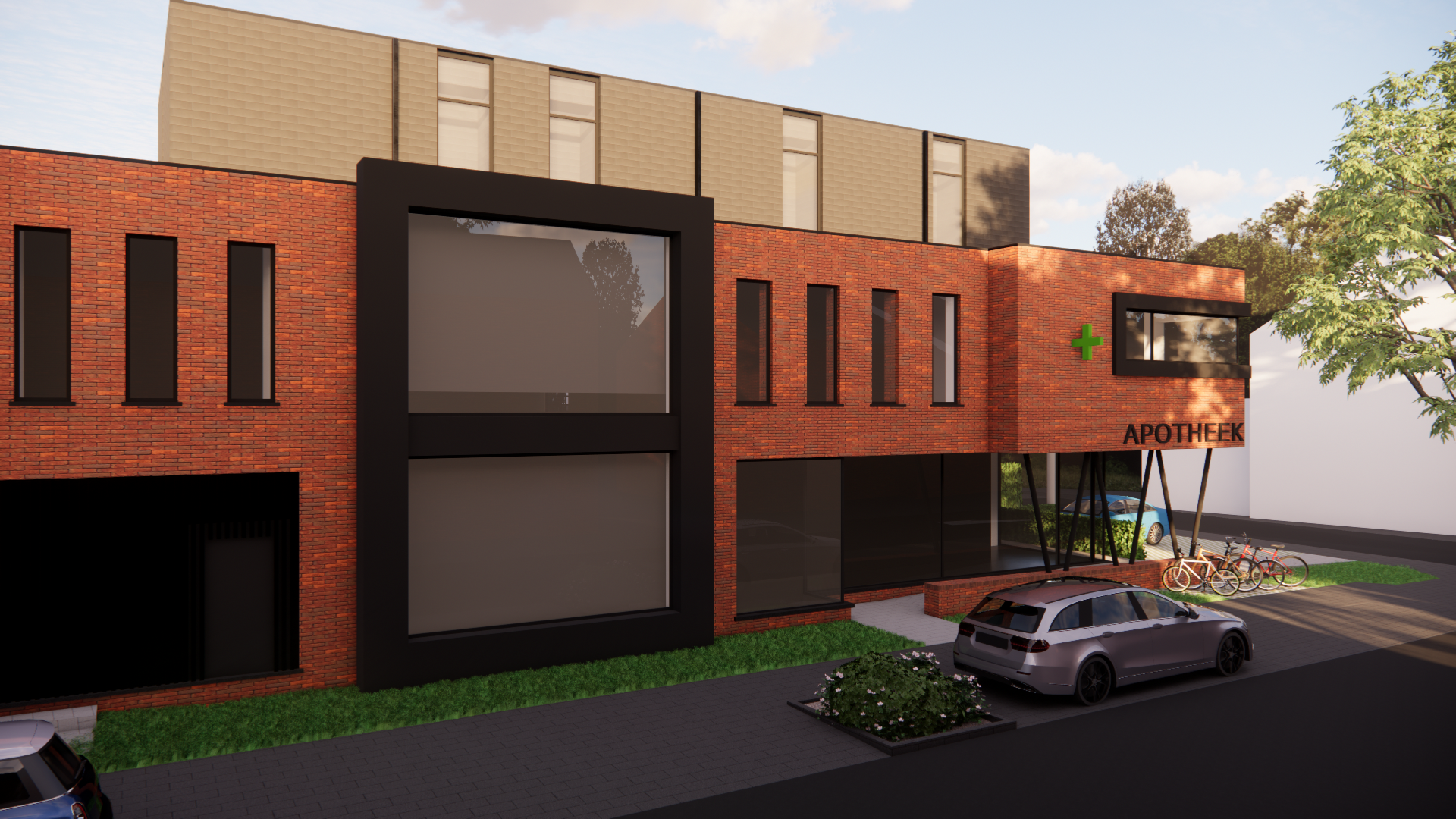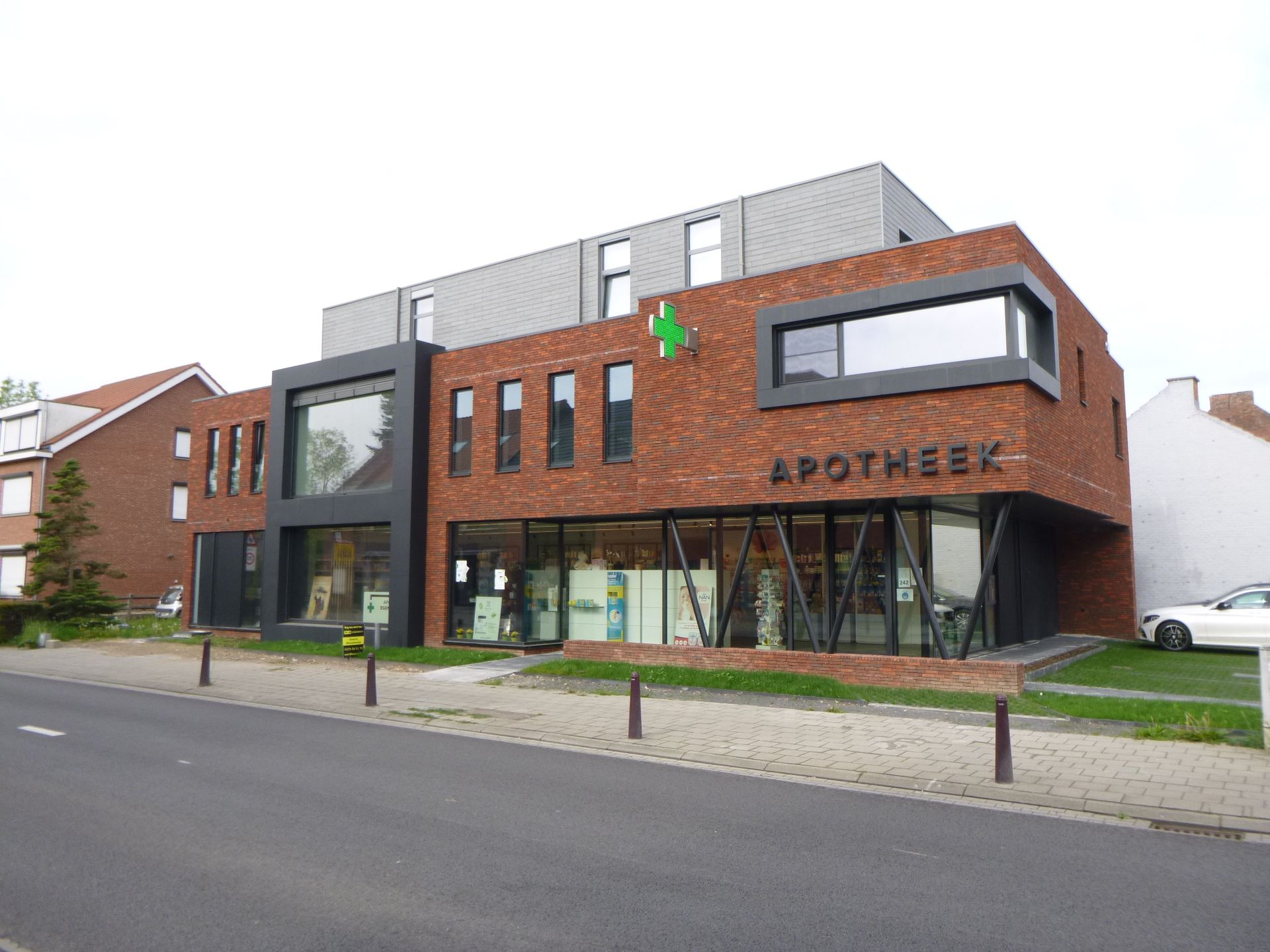 Moderne nieuwbouw apotheek met woongelegenheid en parking bij Leuven (Egenhoven). De apotheek en woonentiteiten hebben een aparte ingang.