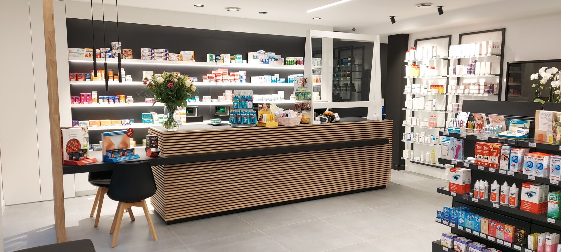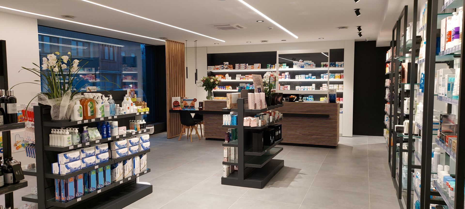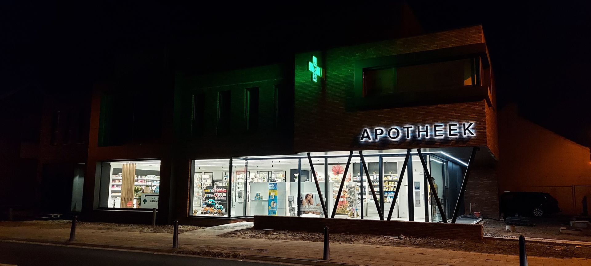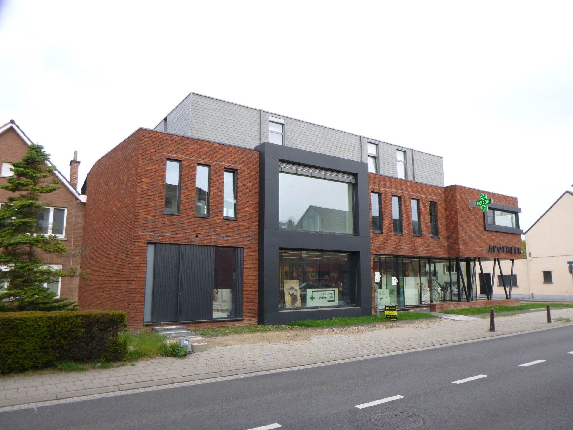 Moderne nieuwbouw apotheek met woongelegenheid en parking bij Leuven (Egenhoven). De apotheek en woonentiteiten hebben een aparte ingang.