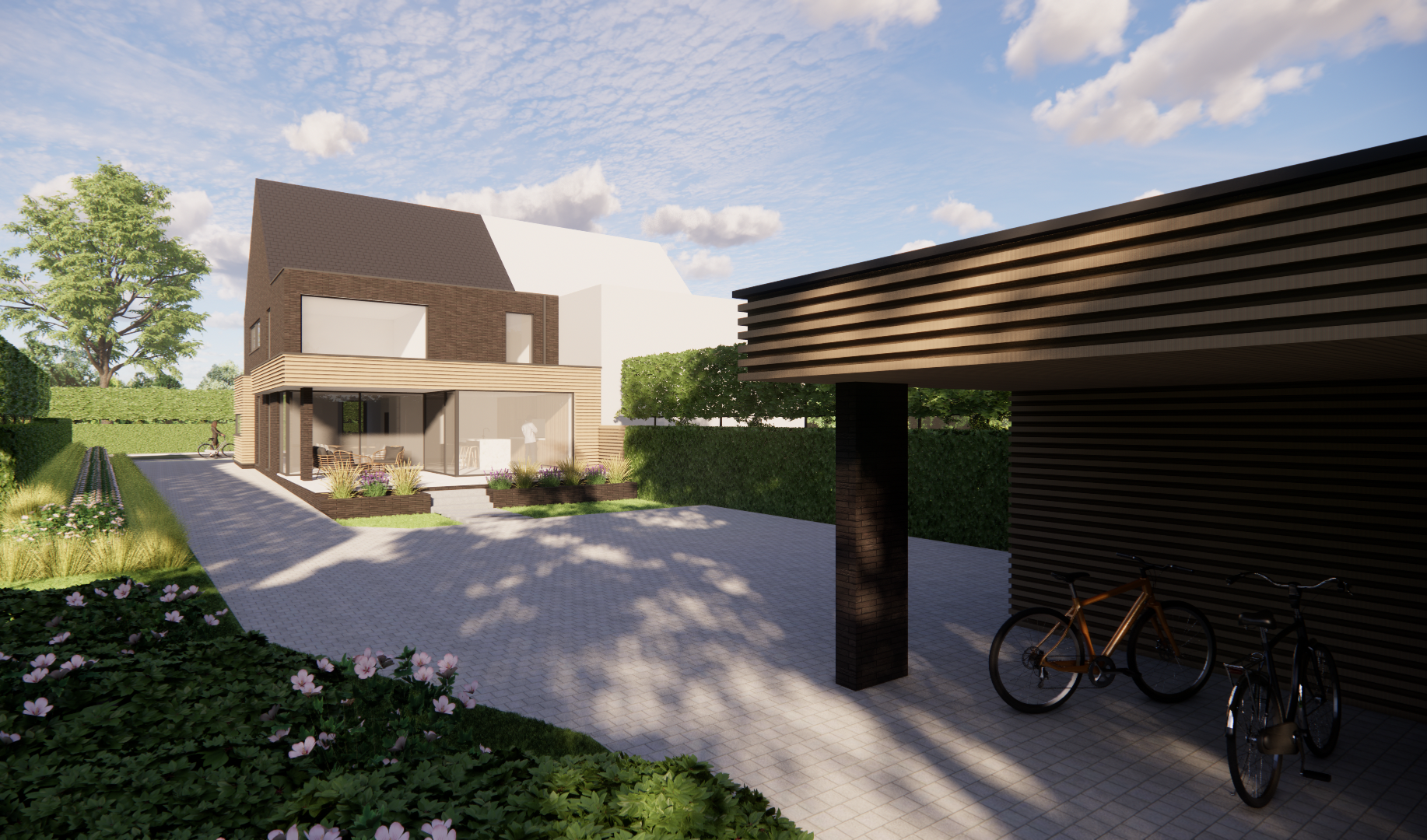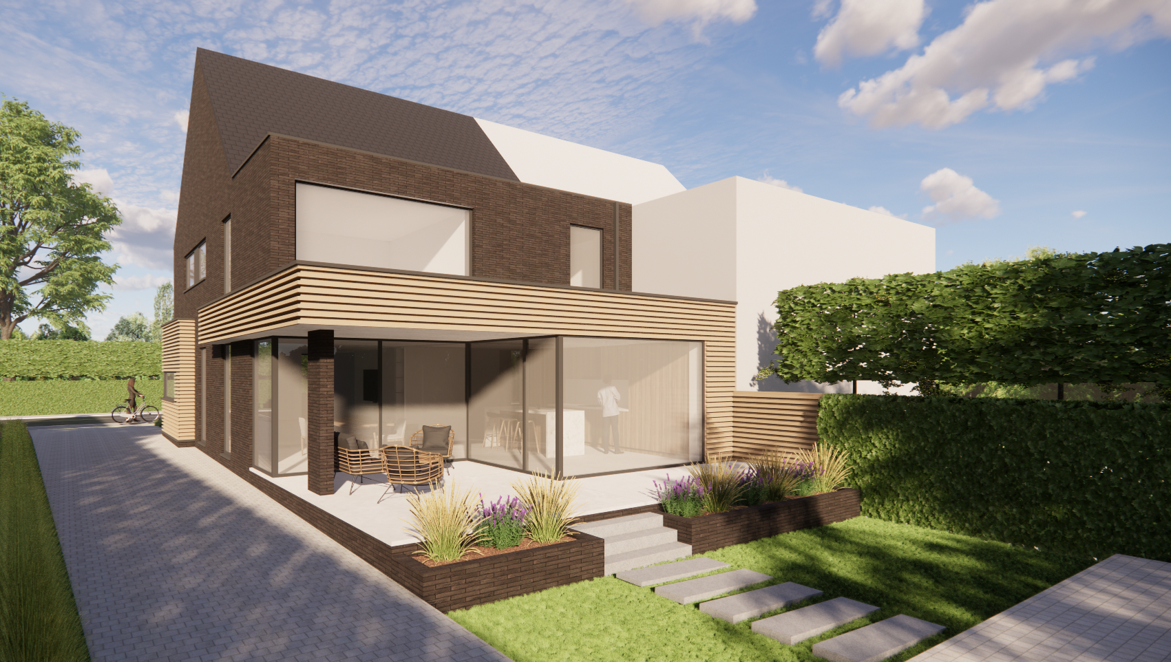 Moderne nieuwbouwwoning in Westerlo in gevelsteen en hardhout. Lage energiewoning met warmtepomp en zonnepanelen. Deze moderne architectuur is een ontwerp van architect Jeroen Janssens.